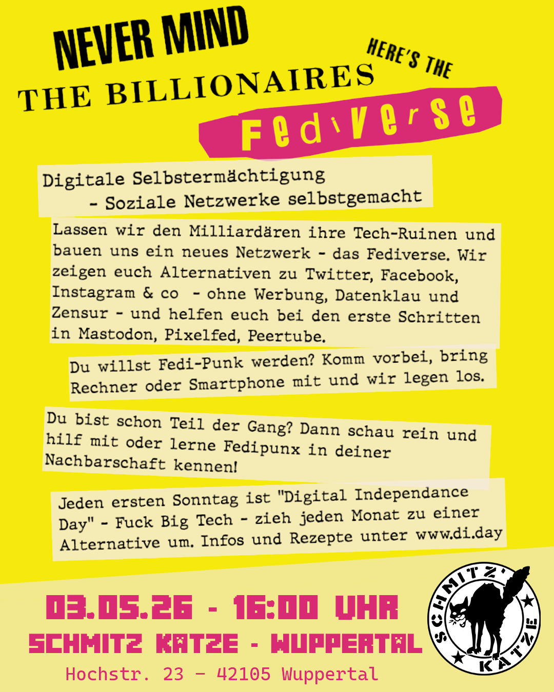 Digitale Selbstermächtigung - Soziale Netzwerke selbstgemacht Lassen wir den Milliardären ihre Tech-Ruinen und bauen uns ein neues Netzwerk - das Fediverse. Wir zeigen euch Alternativen zu Twitter, Facebook, Instagram & co - ohne Werbung, Datenklau und Zensur - und helfen euch bei den ersten Schritten in Mastodon, Pixelfed, Peertube. Du willst Fedi-Punk werden? Komm vorbei, bring Rechner oder Smartphone mit und wir legen los. Jeden ersten Sonntag ist "Digital Independance Day" - Fuck Big Tech - zieh jeden Monat zu einer Alternative um. Infos und Rezepte unter https://www.di.day Los geht' so um 16:00h, kommt an, schnappt euch 'nen Kaffee, nach einer kurzen Vorstellung was das Fediverse ist und was ihr dort machen könnt geht's ab an die Geräte oder in die analoge Diskussion. |