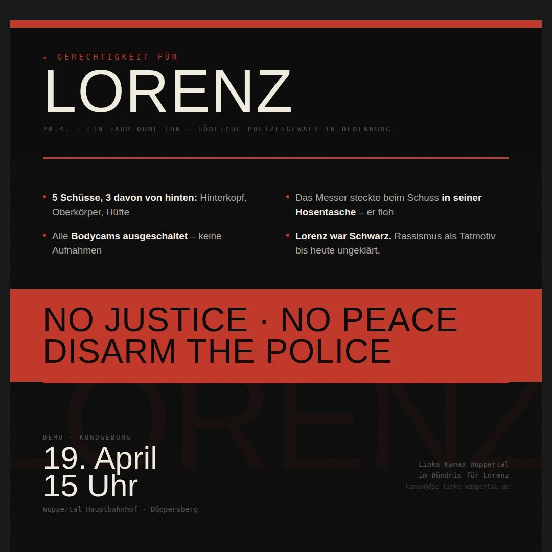 - 15:00 – 17:00, 19. April 2026 – Gerechtigkeit für Lorenz (Wuppertal Hbf (Bahnhofsvorplatz))