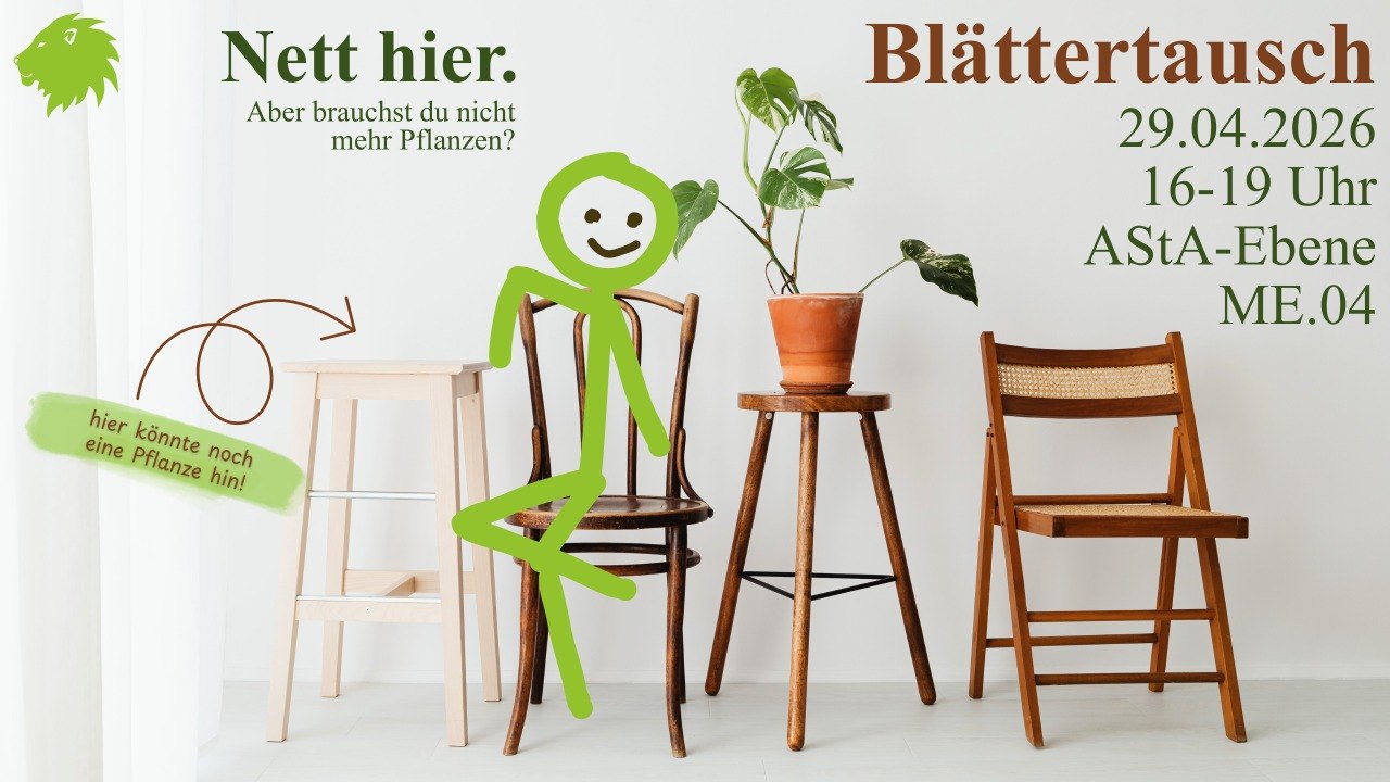 - 16:00 – 19:00, 29. April 2026 – AStA Blättertausch (Asta-Ebene)